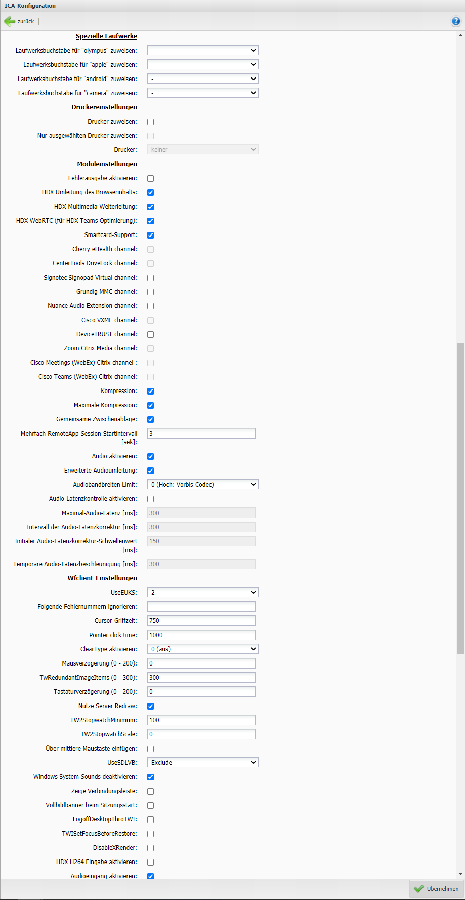 Dieser Konfigurationsdialog enthält Verbindungsparameter, die allen ICA-Verbindungen bei der Einrichtung zugewiesen werden können.