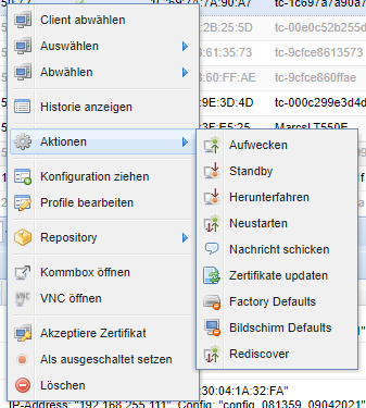 Mit lassen sich sowohl 'Geplante Aktionen' erstellen, als auch Aktionen direkt durchführen, die auf alle ausgewählten Clients angewendet werden:
