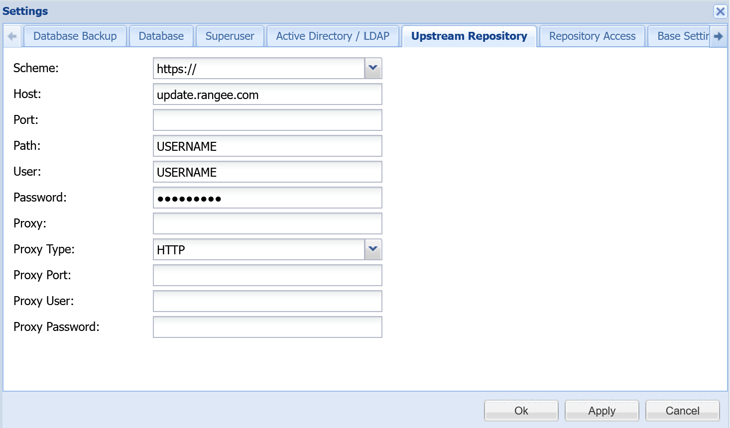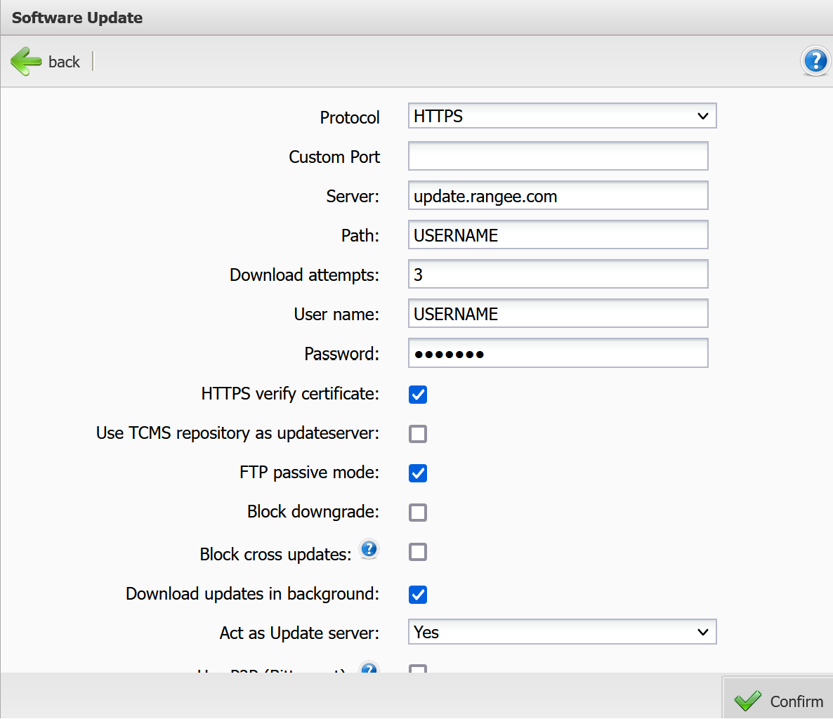 3. Geben Sie im folgenden Fenster Ihre Updateserver-Daten ein. Diese erhalten Sie von support@rangee.com